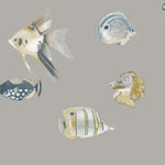 Large-scale hand-painted fish with metallic touches glide across this contemporary wallpaper, which glistens as the light catches it.