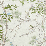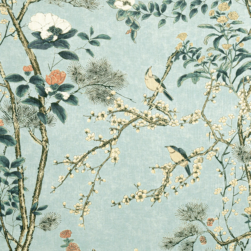 Airy and artistic, Katsura showcases gracious linework with fine vertical branches, blossoms, and birds.