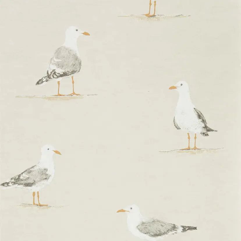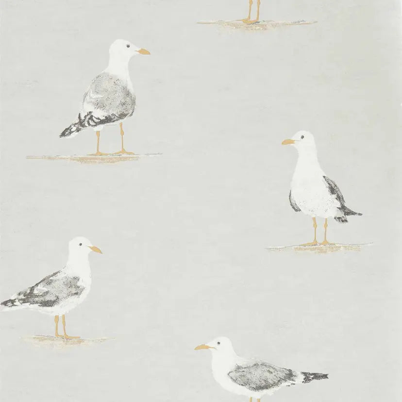 Friendly seagulls perch on the sand in this charming hand painted wallpaper. Originally created with thick layers of gouache paint to give a stylized, brushstroke texture, this design is available in four gentle colorways